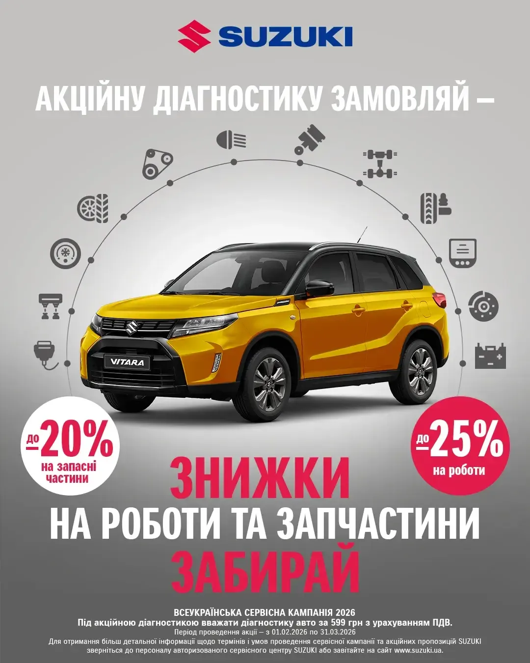 ТОВ «Житомир Авто Інтернешнл» повідомляє про старт традиційної сервісної кампанії. В період з 02 лютого по 31 березня 2026 року власники автомобілів SUZUKI можуть провести комплексну діагностику* свого автомобіля всього за 599 гривень**, та за підсумком діагностики отримати до 25% знижки на роботи з обслуговування авто і до 20% на необхідні запасні частини***.